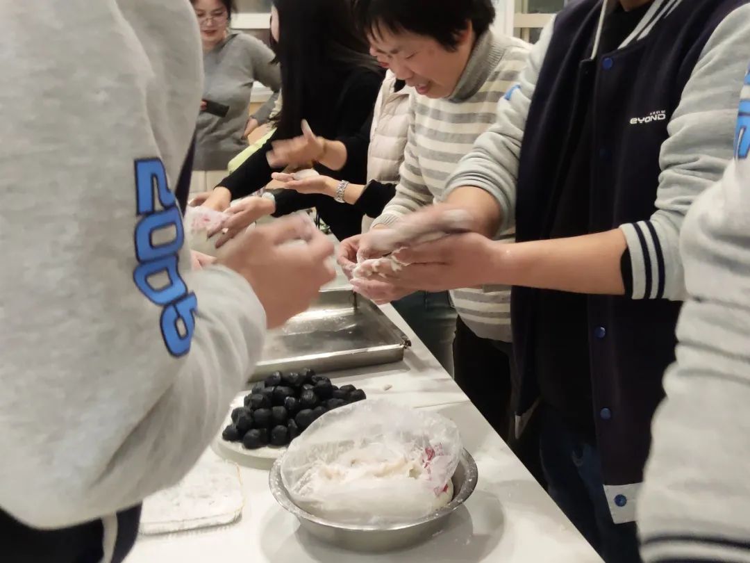 加水,和面、揉面、包餡,揉成型,一個個白白胖胖的元宵就出現(xiàn)在全體員工眼前。胖乎乎的大湯圓,吃了就元?dú)鉂M滿;小巧玲瓏的小湯圓,勝在可愛又喜慶。